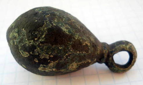 Кистень грушевидный уплощенный с черненым орнаментом, 70 гр., тип 3 по Кирпичникову, вторая половина 12-13 вв. Черниговская обл.