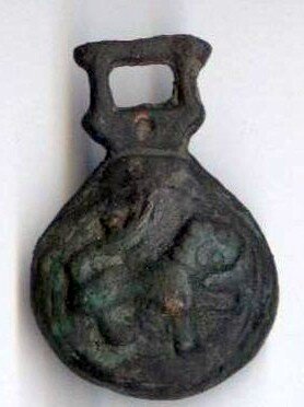 Кистень круглый уплощенный с изображением льва (?) с двух сторон, тип 3А по Кирпичникову, 12-13 вв. (фото 1)