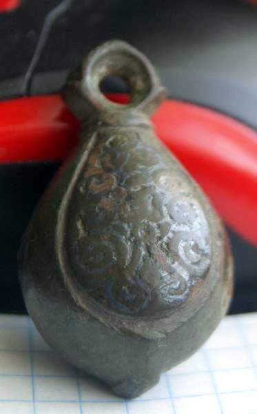 Кистень грушевидный уплощенный с черненым орнаментом, 30,3 гр., тип 3 по Кирпичникову, вторая половина 12-13 вв. Житомирская обл. Андрушевский район