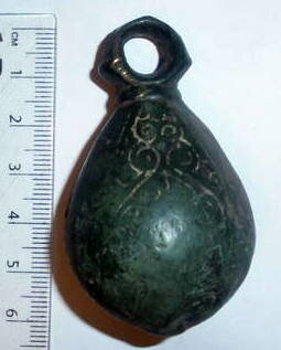 Кистень грушевидный уплощенный с черневым орнаментом, тип 3 по Кирпичникову, вторая половина 12 - 13 вв. Киевская обл.