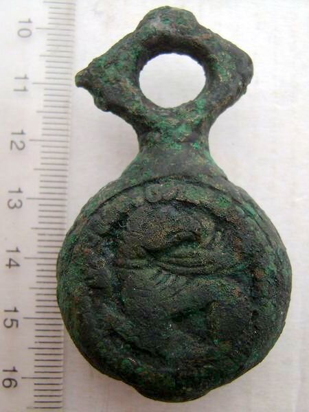 Кистень круглый уплощенный с изображением грифона (?) с обоих сторон, тип 3А по Кирпичникову, 12-13 вв. (фото 3)