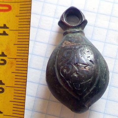 Кистень грушевидный уплощенный с черневым орнаментом, 25,8 гр., тип 3 по Кирпичникову, вторая половина 12 - 13 вв. Киевская обл.