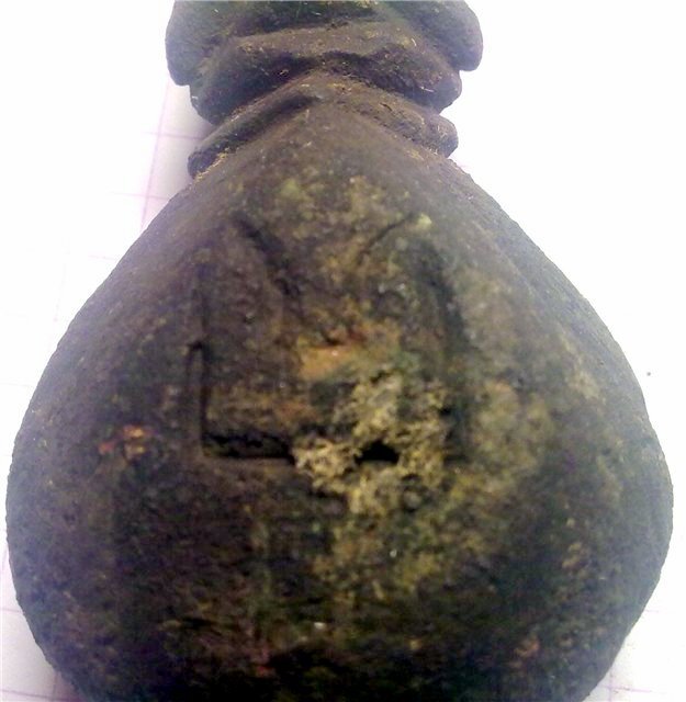 Кистень круглый уплощенный с владельческими знаками графити с обоих сторон, тип 3А по Кирпичникову, 12-13 вв. (фото 1)