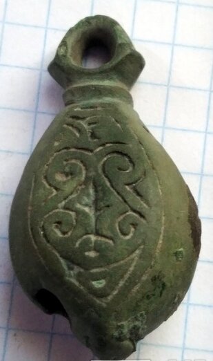 Кистень грушевидный уплощенный с черневым орнаментом, 22,1 гр., тип 3 по Кирпичникову, вторая половина 12 - 13 вв. Черниговская обл.
