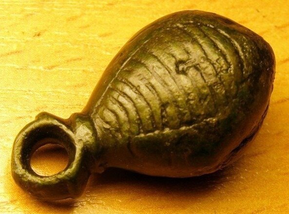 Кистень грушевидный уплощенный с черневым орнаментом, тип 3 по Кирпичникову, вторая половина 12 - 13 вв.