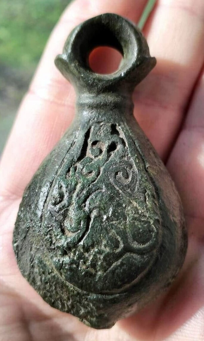 Кистень грушевидный уплощенный с черневым орнаментом, тип 3 по Кирпичникову, вторая половина 12 - 13 вв.