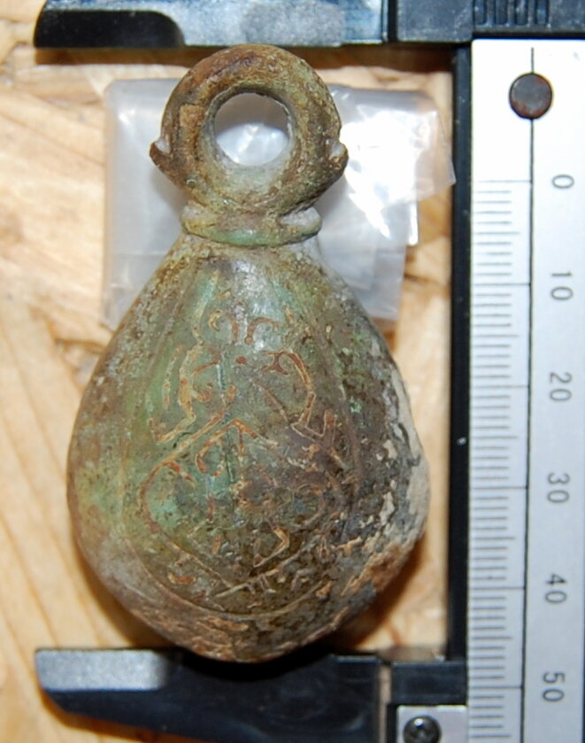 Кистень грушевидный уплощенный с черневым орнаментом, тип 3 по Кирпичникову, вторая половина 12 - 13 вв.