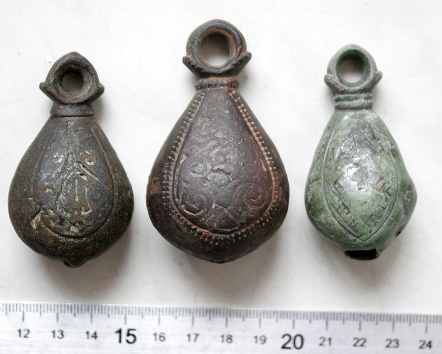 Кистени грушевидные уплощенные с черневым орнаментом, тип 3 по Кирпичникову, вторая половина 12 - 13 вв.