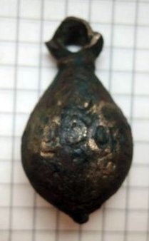 Кистень грушевидный уплощенный с черневым орнаментом, 150 гр., тип 3 по Кирпичникову, вторая половина 12 - 13 вв.