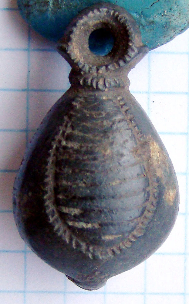 Кистень грушевидный уплощенный с черневым орнаментом, тип 3 по Кирпичникову, вторая половина 12 - 13 вв. (фото 1)