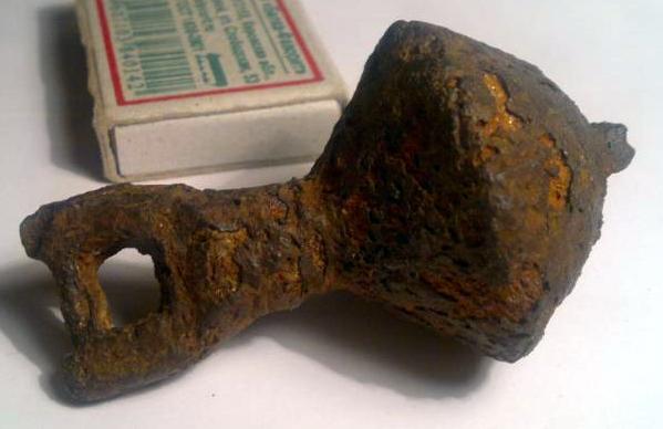 Кистень биконической формы с квадратным ушком, тип 6 по Кирпичникову, 12-13 вв.
