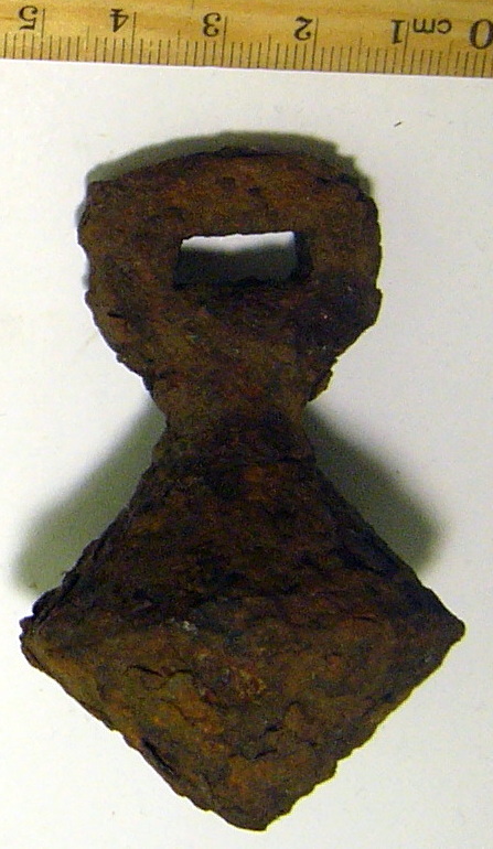 Кистень биконической формы с квадратным ушком, тип 6 по Кирпичникову, 12-13 вв.