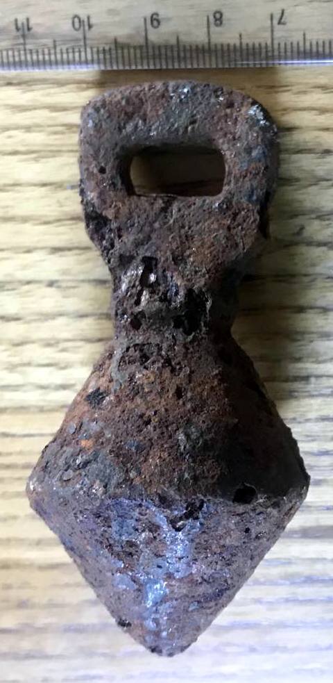 Кистень биконической формы с квадратным ушком, тип 6 по Кирпичникову, 12-13 вв.