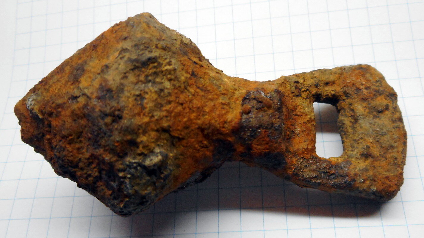 Кистень биконической формы с квадратным ушком, тип 6 по Кирпичникову, 12-13 вв.
