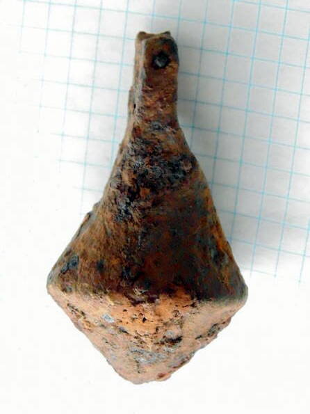 Кистень биконической формы с квадратным ушком, тип 6 по Кирпичникову, 12-13 вв.