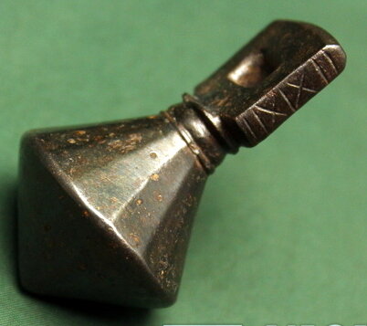Кистень биконической формы с квадратным ушком, тип 6 по Кирпичникову, 12-13 вв.