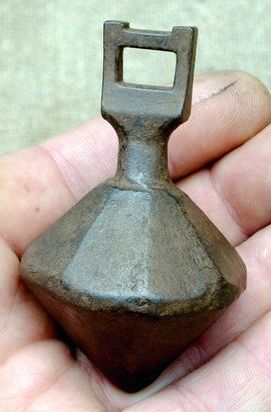 Кистень биконической формы с квадратным ушком, 350 гр., тип 6 по Кирпичникову, 12-13 вв.