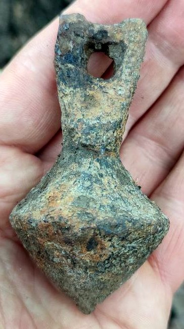 Кистень биконической формы с квадратным ушком, тип 6 по Кирпичникову, 12-13 вв.