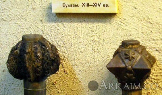 1 - Шестопер, тип 6 по Кирпичникову. Новгород, 13 в. 2 - Булава, тип 3 по Кирпичникову