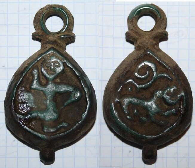 Кистень круглый уплощенный с изображением воина с одной стороны и лютого зверя с другой, тип 3А по Кирпичникову, 125,66 гр., 12-13 вв., половцы?