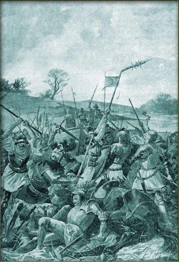 Битва при Судомерже 25 марта 1420 года, одно из первых крупных сражений гуситских войн. Отчётливо видны двуручный кистень и молотило в руках воинов. Картина Фердинанда Хеттеша, начало XX века.