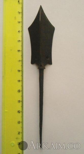 Шестиугольный с сужением в нижней 1/3 трехлопастной наконечник орнаментированный отверстиями в лопастях, группа 1 тип 1 по Худякову, 6-12 вв., енисейские кыргызы из Минуса