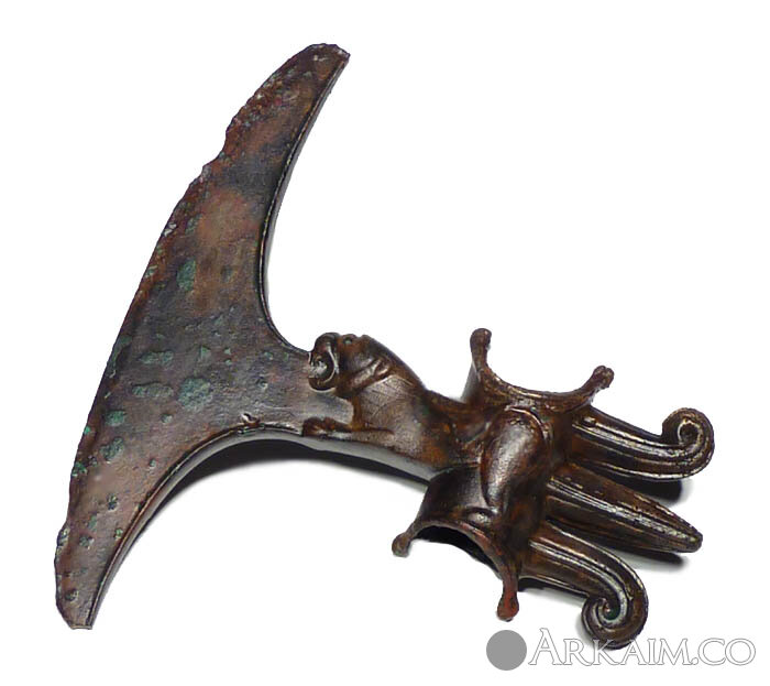 Секировидный втульчатый топор с чеканом выполненный в зверином стиле (лев в прыжке удерживающий лезвие топора), 15х16 см, бронза, 2 тыс. до н.э. Луристан, Ирак (фото 1)