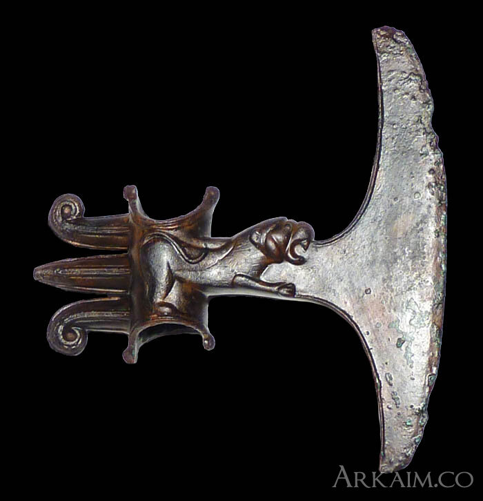 Секировидный втульчатый топор с чеканом выполненный в зверином стиле (лев в прыжке удерживающий лезвие топора), 15х16 см, бронза, 2 тыс. до н.э. Луристан, Ирак (фото 2)