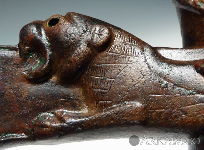 Секировидный втульчатый топор с чеканом выполненный в зверином стиле (лев в прыжке удерживающий лезвие топора), 15х16 см, бронза, 2 тыс. до н.э. Луристан, Ирак (фото 5)