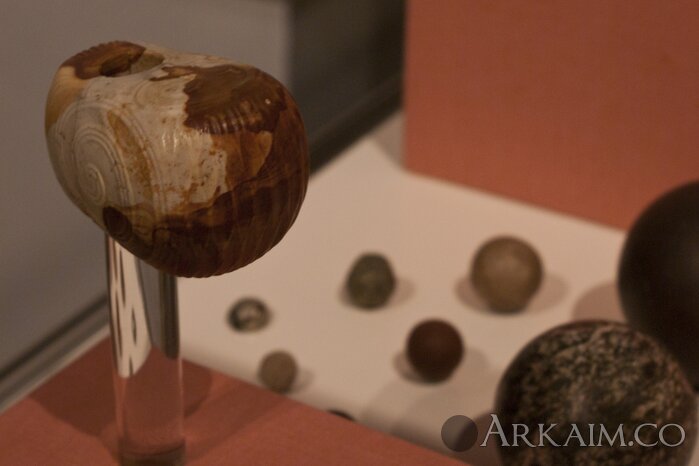 Набалдашник жезла или булавы из Наута. 3000-2000 до н.э. На заднем плане каменные шары разного диаметра.
