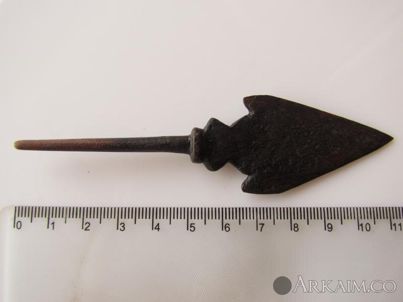 Неописанный тип. Вариант двушипного наконечника с расширяющейся к шипам шейкой с упором, но при этом имеется плоское расширение над упором. Тип 31 по Медведеву, известны со второй половины 12 в. до прихода монгол.