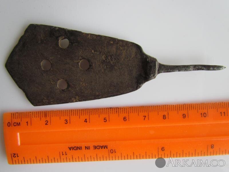 Плоский двухлопастной пятиугольный наконечник с упором орнаментированный отверстиями, тип 36 по Медведеву, 8-9 вв.
