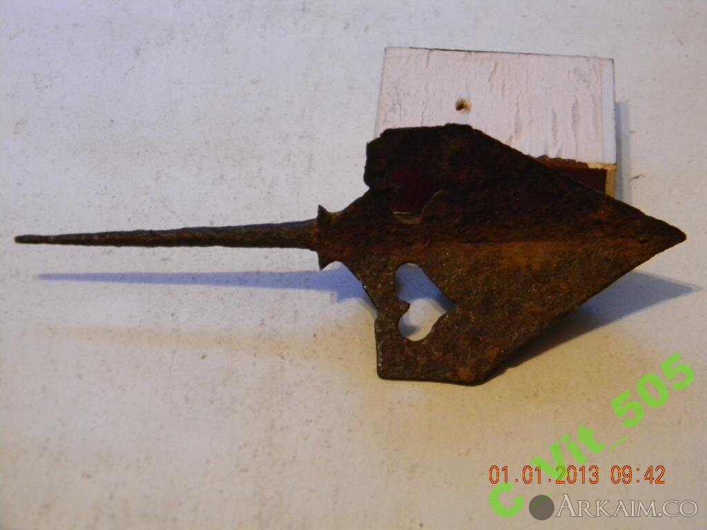 Шатровый трехлопастной наконечник орнаментированный фигурными вырезами, группа 1 тип 1 по Худякову, 11-14 вв.