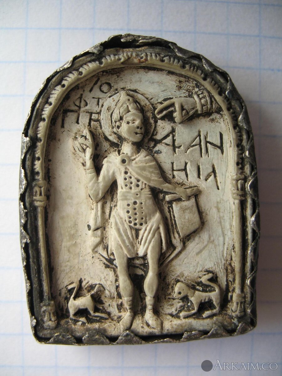 Очень редкий предмет. Сама икона византийского круга выполнена в кости или камне, оправа - металл (серебро?) с позолотой (обратная сторона - следующее фото). Харьковская обл.
