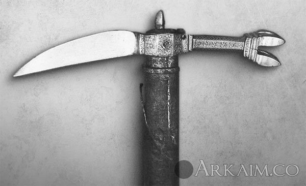 С первого взгляда, это обычный североитальянский полэкс, но его верхний шип утапливается вглубь древка, а в бою выкидывается пружиной и жестко фиксируется.