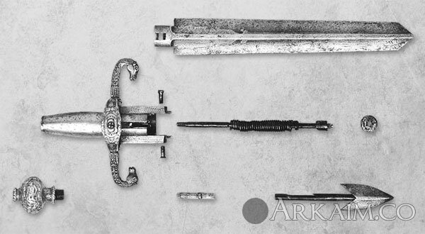 В этом образце, датируемом концом XVI века, полый клинок является стволом пистолета. Съемный наконечник служит защитой ствола, гаечным ключем и, возможно, дополнительным снарядом.