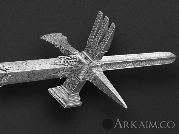 Этот боевой молот был изготовлен в Германии в 1593 г. Покрыт гравировкой, имеет позолоченные медные элементы декора. Верхний шип выдвигается из древка поворотом рукояти.