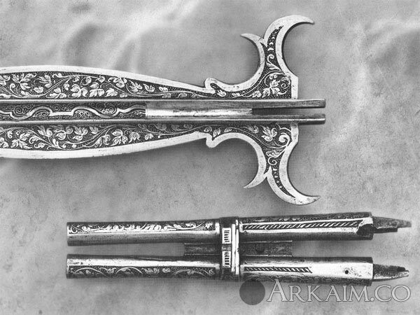 Богато декорированная рогатина изготовлена Петером Пеком (Peter Peck) в Мюнхене прибл. в 1560 г. Стволы расположены с обеих сторон наконечника.