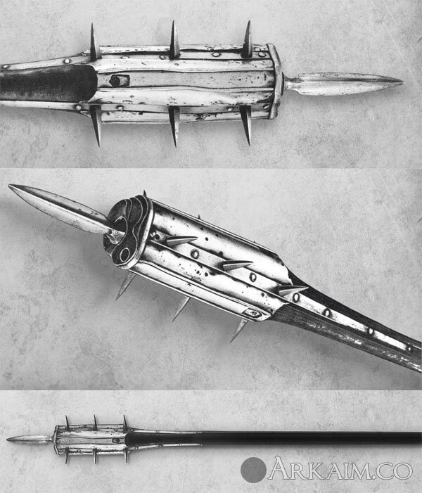 Описывается как трость короля Генриха VIII Тюдора, того самого, что прославился большим числом жен. Перед нами древковое оружие, объединяющее три фитильных пистолета (стволы вместе с запалами скрыты) и ударную часть со множеством шипов.