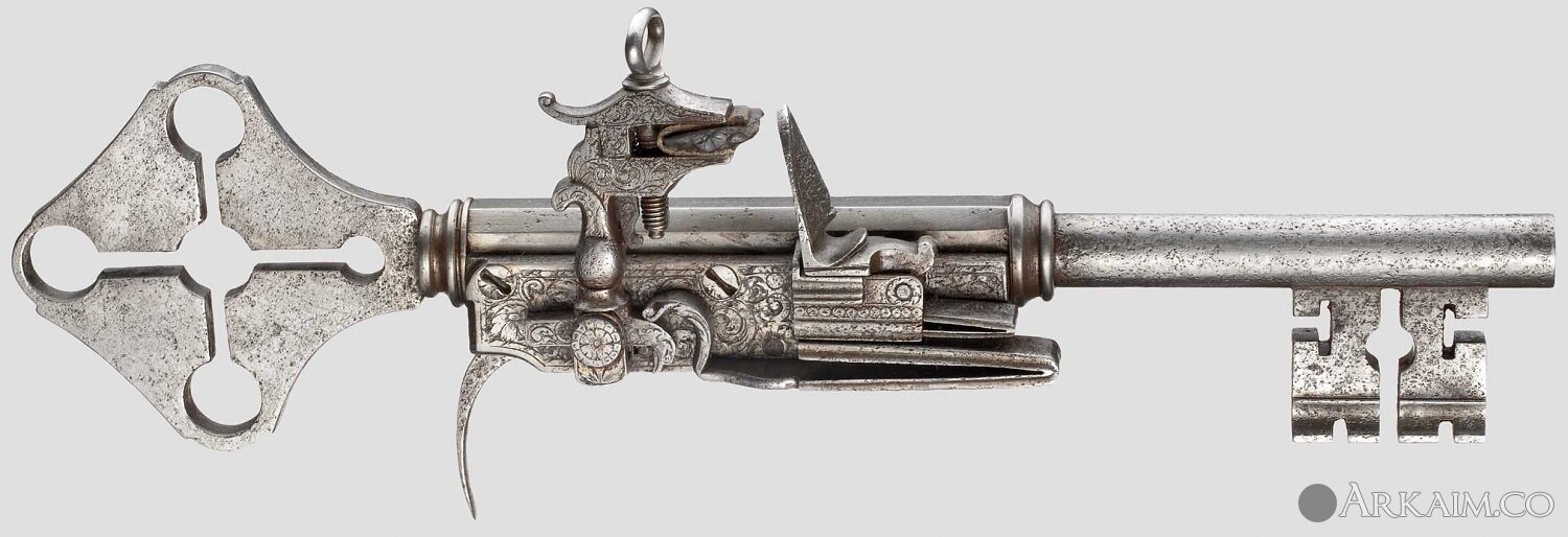 Ключ-пистолет с кремневым замком средиземноморского типа, так называемый микелет (miquelet). Компактность конструкции данных кремневых замков как нельзя лучше подходит для установки на небольшие ключи.