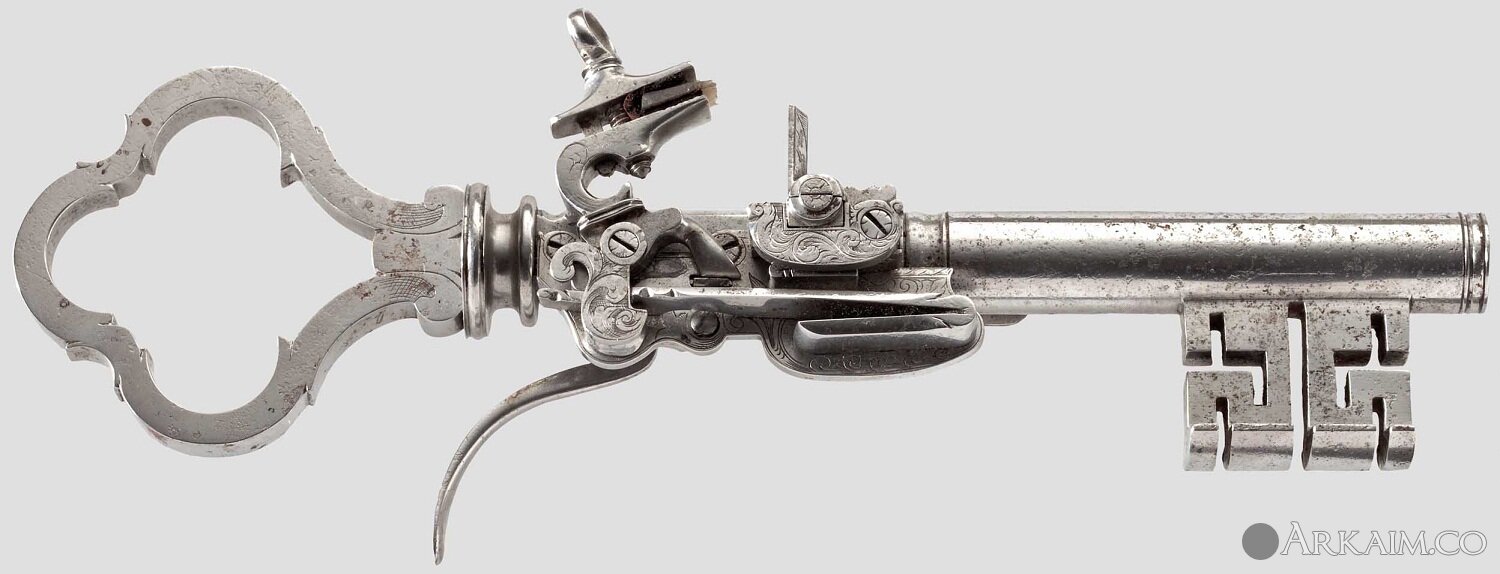 Ключ-пистолет с кремневым замком средиземноморского типа, так называемый микелет (miquelet). Компактность конструкции данных кремневых замков как нельзя лучше подходит для установки на небольшие ключи.