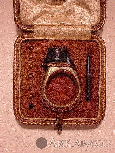 1870 год выпуска, 7 зарядов, 0,6 калибр. Страна производитель Англия. Пистолет вмонтирован в кольцо украшенное простой резьбой, к пистолету прилагается красивый футляр. Более точной информации об этом изделии нет. Возможно, изготовлялось специально как подарок, но дарственная гравировка отсутствует, клеймо мастера неизвестное. К серьезному оружию не относиться, скорее забава для "роковых женщин".