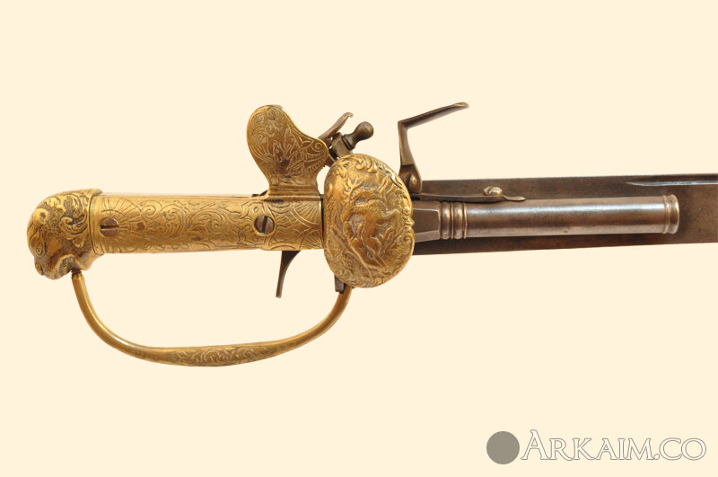 На правой стороне клинка возле рукояти прикреплен ствол с затравочной полкой и крышкой-огнивом. ствол стальной, круглый, в казенной части граненый; отделан в двух местах декоративными поясками. На казенной части ствола сверху квадратная затравочная полка с круглым углублением. Перед полкой прикреплена на поперечной оси стальная крышка-огниво, подпираемая снизу плоской одноперой пружиной. Клинок со стволом упирается в вытянутое стальное перекрестье, за которым на хвостовик клинка насажена рукоять.