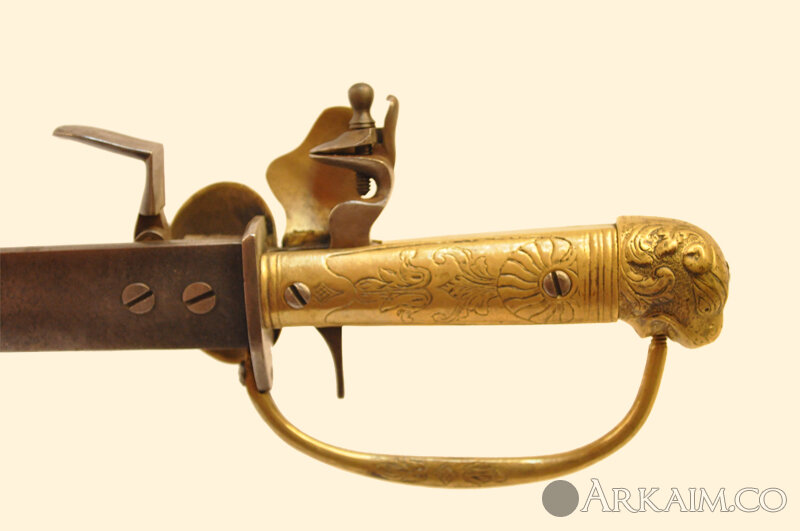 На правой стороне клинка возле рукояти прикреплен ствол с затравочной полкой и крышкой-огнивом. ствол стальной, круглый, в казенной части граненый; отделан в двух местах декоративными поясками. На казенной части ствола сверху квадратная затравочная полка с круглым углублением. Перед полкой прикреплена на поперечной оси стальная крышка-огниво, подпираемая снизу плоской одноперой пружиной. Клинок со стволом упирается в вытянутое стальное перекрестье, за которым на хвостовик клинка насажена рукоять.