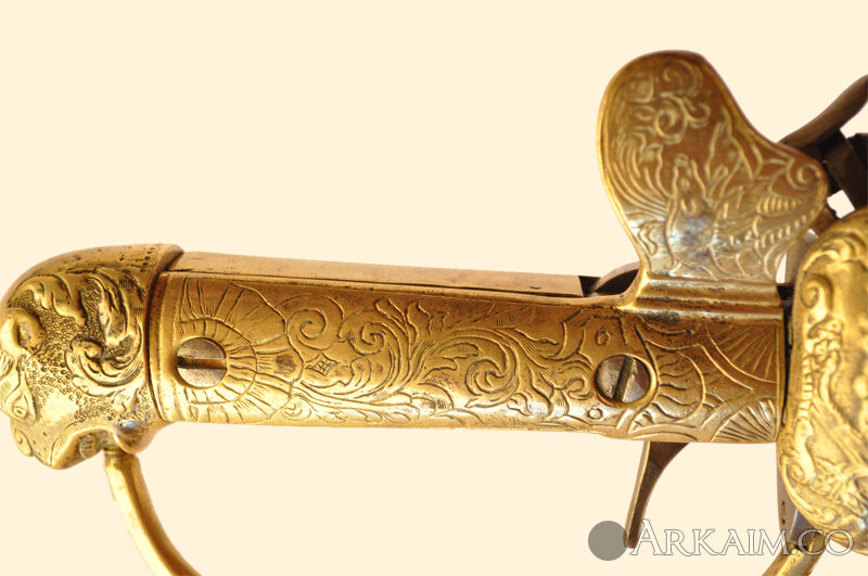 Рукоять состоит из двух литых латунных половинок, прикрепленных к хвостовику клинка на двух винтах с каждой стороны. Обе половинки рукояти украшены неглубоким растительным орнаментом. К нижней чатси рукояти присоединена латунная дужка с неглубоким орнаментом; закреплена в навершии рукояти и винтом в перекрестье. Навершие рукояти латунное в виде головы леопарда.