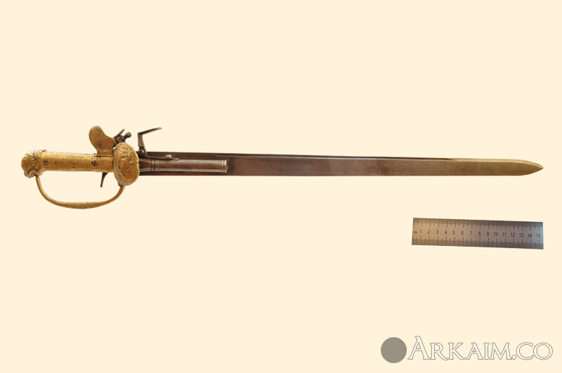 На правой стороне клинка возле рукояти прикреплен ствол с затравочной полкой и крышкой-огнивом. ствол стальной, круглый, в казенной части граненый; отделан в двух местах декоративными поясками. На казенной части ствола сверху квадратная затравочная полка с круглым углублением. Перед полкой прикреплена на поперечной оси стальная крышка-огниво, подпираемая снизу плоской одноперой пружиной. Клинок со стволом упирается в вытянутое стальное перекрестье, за которым на хвостовик клинка насажена рукоять.