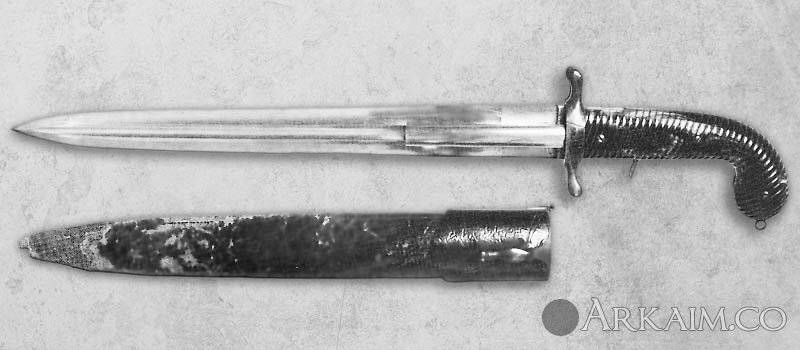 Кинжал с пистолетом, образца 19-го века. Ствол капсульного пистолета становиться виден только когда кинжал извлечён из ножен. Спусковой механизм спрятан в рукоятке кинжала и, тоже, практически не виден.