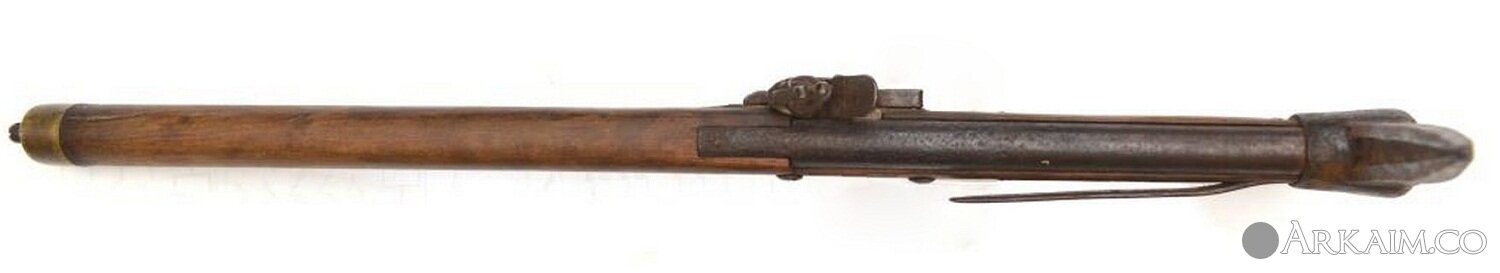Абордажный топор с кремневым пистолетом, судя по конструкции замка, вероятно изготовлен во Франции примерно в 1770 — 1780 годах. Общая длина оружие 667 мм, ширина лезвия топора 130 мм. Ствол имеет длину 278 мм, калибр канала ствола 14 мм (фото 5)