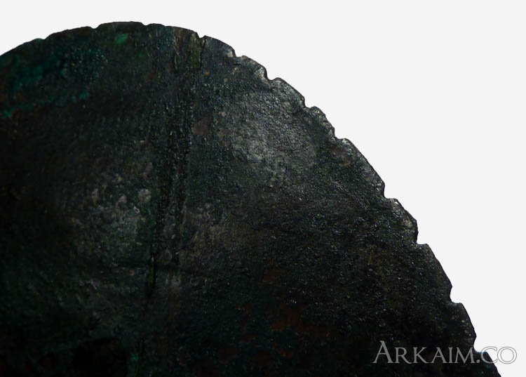 Нож туми (ритуальный или медицинский) со следами минеральных волокон и зубцами для трепанации, 14,5х11,5 см, бронза, 100-800 гг. н.э. Западное побережье Южной Америки (фото 4)