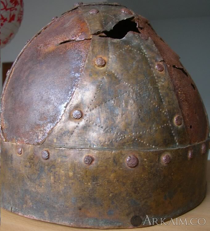 Вестготский шлем, типа Spangenhelm, относящийся к 5 веку н.э.. Шлем сделан из четырёх медных пластин-рёбер, соединённых железными пластинами внутри. Рёбра имеют рельефные рисунки в форме латинского креста на двух противоположных рёбрах и пересекающиеся линии - образующие треугольники на других двух. Вверху шлем имеет навершие - медный диск. Есть и еще один железный диск - внутри шлема под медным диском. Внутри, под четырьмя заклепками, которые были использованы в качестве крепления подкладки, остались несколько фрагментов ткани, вероятно, хлопка или льна.
